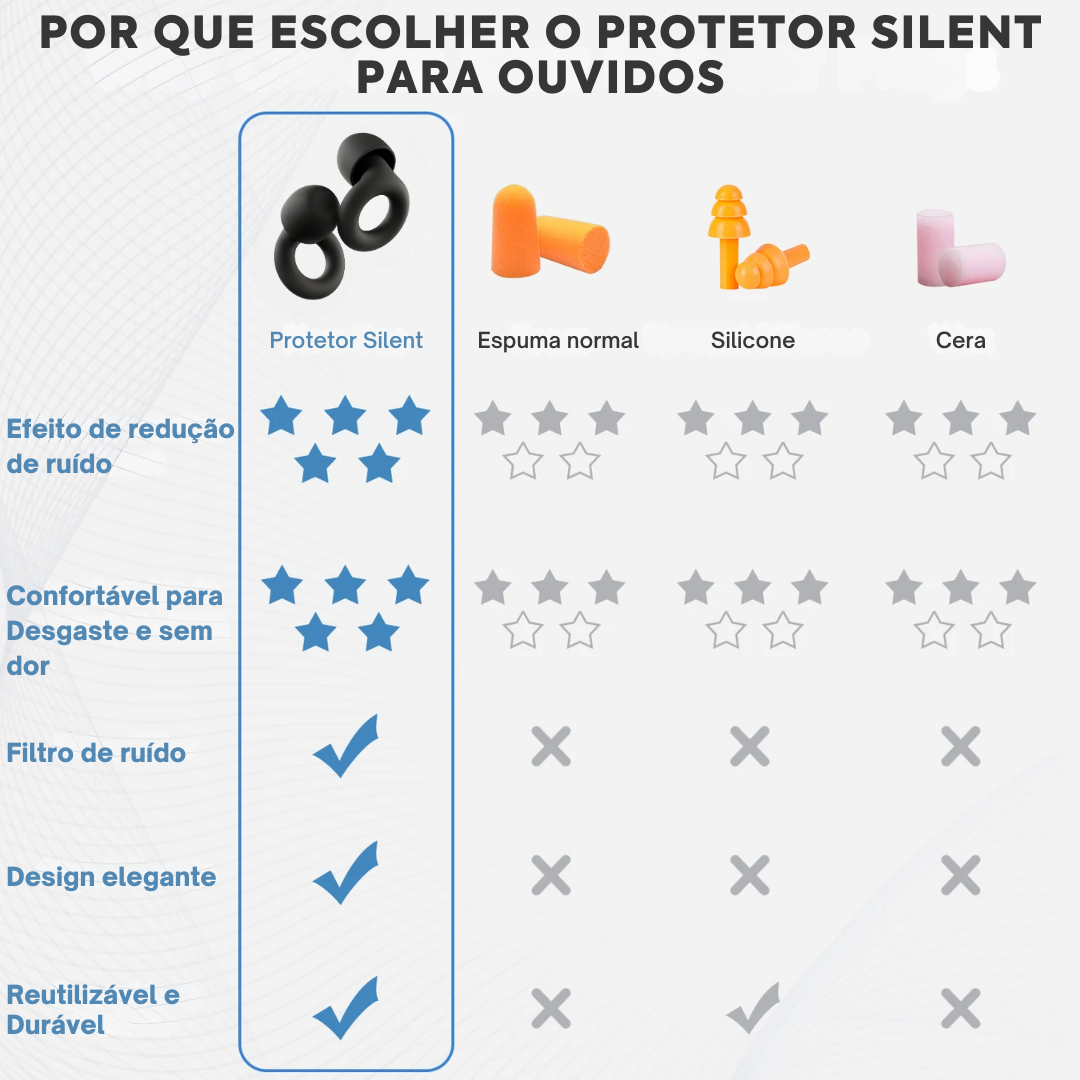 Os protetores auriculares Silent oferecem proteção auditiva certificada, reduzindo o ruído em 17 dB (SNR), garantindo a segurança dos seus ouvidos em ambientes ruidosos.